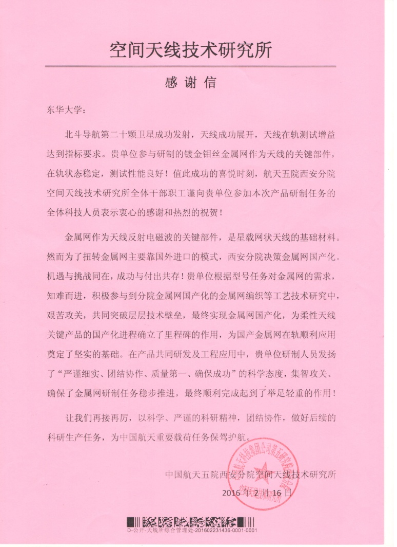 近日,我校纺织学院陈南梁教授研究团队收到中国航天五院西安分院空间天线技术研究所的感谢信,对为北斗导航第十二颗卫星发射成功作出突出贡献的该研究团队全体成员表示衷心感谢和热烈祝贺。