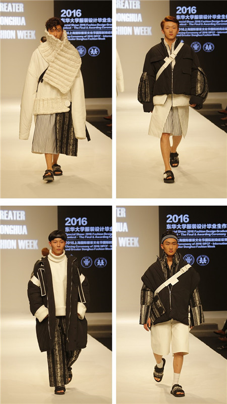 蒋昌俊为本届服装设计毕业设计作品大赛的金奖获得者颁奖并宣布闭幕,刘春红为年度东华新锐设计师金奖获得者颁奖。本次毕业设计大赛的主题为“出走(GET FREE)”,比赛分为“成衣设计”和“创意设计”两个系列,共设金奖1名、银奖3名、铜奖3名、导师推荐奖4名以及优秀奖10名,共计21个获奖名额。初赛共收到480套设计作品,年轻的设计师们通过天马行空的设计理念和别出心裁的材质运用,多方面展示自己的大胆创意,用自己的方式演绎面对时尚的年轻心态,自由地表达自我个性,呈现最冲动、最富热情的新鲜感,不受约束和羁绊。经过初赛为期四天的严格筛选,160套作品成功入围决赛。决赛现场,名为《Lostand Found》的作品让人眼前一亮,设计师方芳告诉记者,作品主题意喻为“在迷失中寻找”,灵感来源于设计师对多重人格症的研究,设计中采用了对比鲜明的黑白两色形成强烈的视觉反差,大廓形的造型营造出厚重且束缚的感觉。