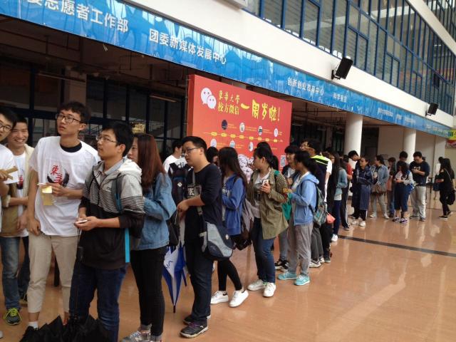 (学生排起长队积极参与线下微信推广互动)