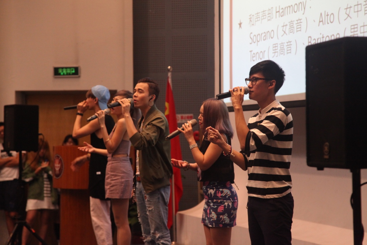 讲座中,乐团先后演绎了《蔡依林组曲》、《思念是一场病》、I'm Yours等不同曲风的经典曲目,多形式、多角度、全方位地为师生详细介绍阿卡贝拉这一音乐形式。在分享环节,既介绍了当代阿卡贝拉欧美团队,也为现场师生们讲解古代传统阿卡贝拉和现代阿卡贝拉的区别,并从演唱者人数、曲风、声乐训练、个性特质、设备等多方面比较了人声乐团和合唱团的区别。讲座中,乐团还进行了阿卡贝拉的现场教学。通过分解每一个声音,逐一地为师生演绎各个声部之间配合演唱阿卡贝拉的要点:一是音量的平衡;二是音色的融合。他们还现场模仿了大鼓、二胡、古筝等各种乐器的声音。