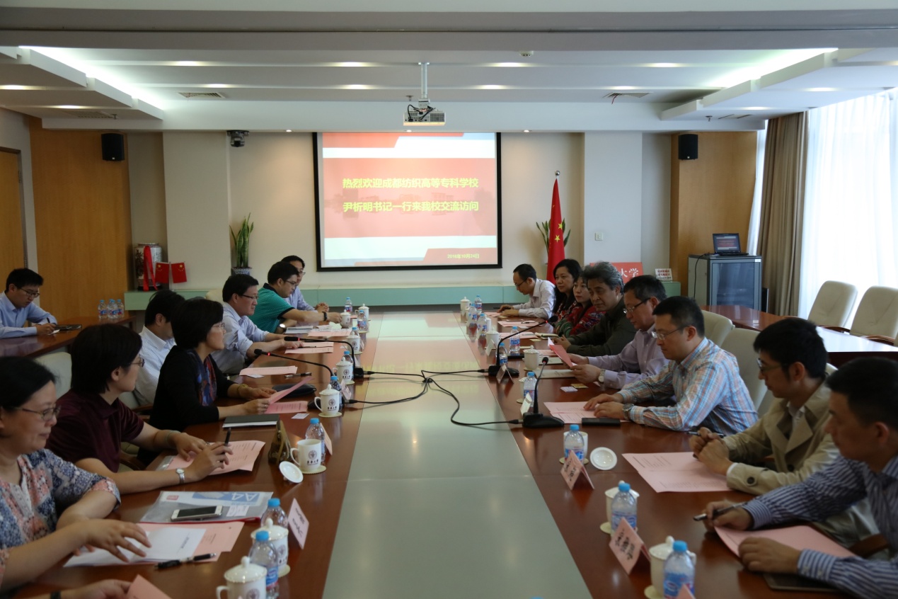 10月24日,成都纺织高等专科学校党委书记尹析明、副校长黄诚等一行来校调研交流,校党委副书记刘淑慧、副校长邱高出席交流座谈会。