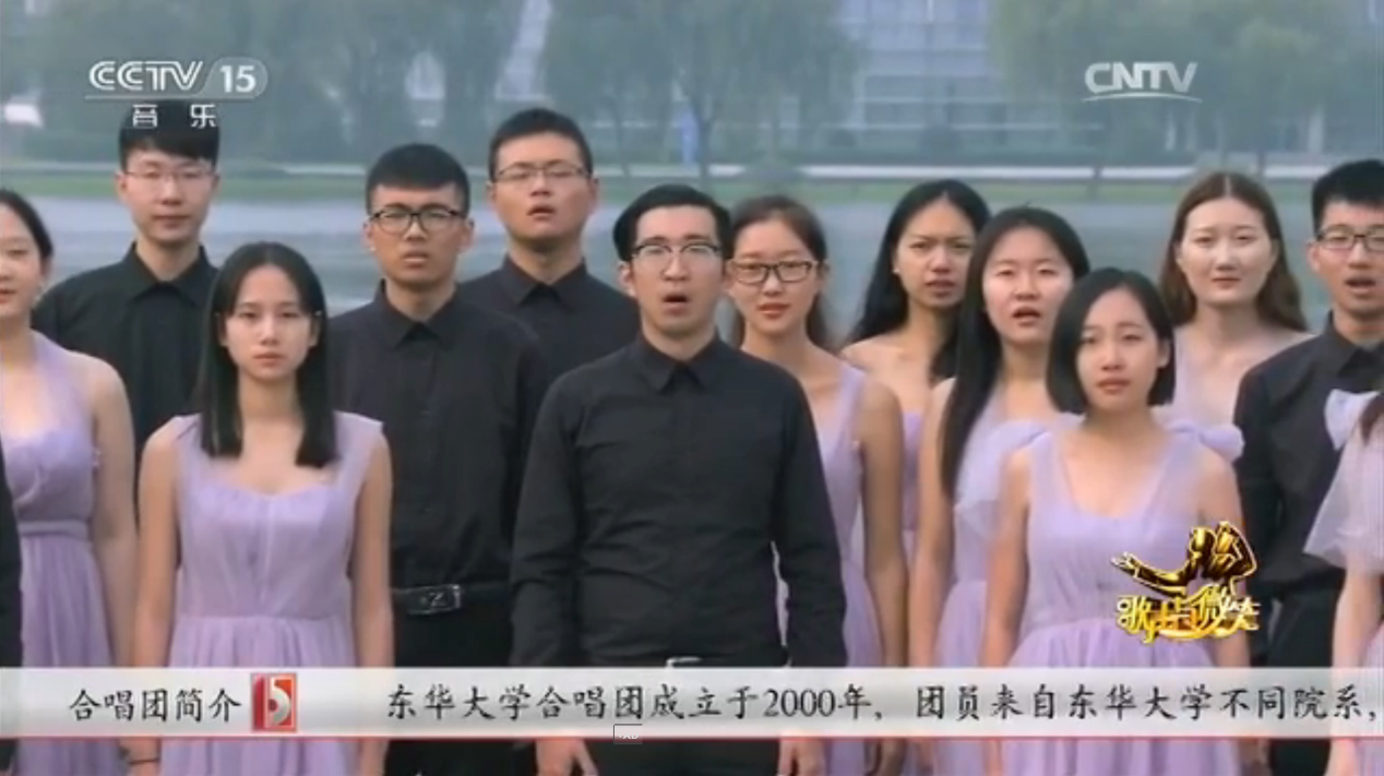 近日,我校合唱团登上中央电视台舞台,在央视十五套音乐频道《歌声与微笑》栏目中演唱了在第五届上海无伴奏合唱比赛中获得金奖的合唱作品《偶然》和《Nyon Nyon》,在全国观众面前展示了东华学子风采。