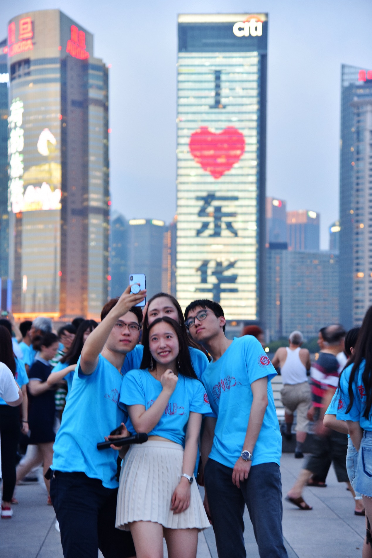 当“I❤东华”“东华人,有气质”“崇德博学 砺志尚实”“经纬中国 锦绣东华”等字样的“灯光秀”出现在“外滩之窗”电子屏幕上,一时间,相关的短视频、照片以及合影“刷爆”了东华人的朋友圈。这些东华人专属的“祝福语”由学校团委通过广泛征集而来,凝结了“校园共识”和“东华初心”,让祝福语“有态度”,更容易走进师生内心。