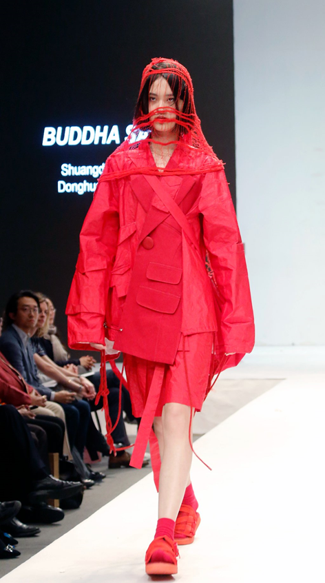 看中国古典四大名著也能找到设计灵感?我校大三学生李双东海做到了。其作品《悟空》捧得大赛二等奖,以穿越的创意灵感,将中国古典文学中的人物形象与时尚设计巧妙融合。就读于服装学院服装与服饰设计专业的李双东海在动手设计前,先一头扎进了小时候看过的小说《西游记》里。她的设计灵感来自对孙悟空形象的思考,想找出在世俗束缚下的英雄主义,探索社会与人的禁锢与反禁锢拉扯力量,设计中大胆解构西装,将西装面料和杜邦纸结合,似乎是一场最原始粗糙的人类动力和精致体面的社会面具的戏剧冲突。服装用色来自于僧人的袈裟,强烈的红色让这场冲突变得更加激烈。