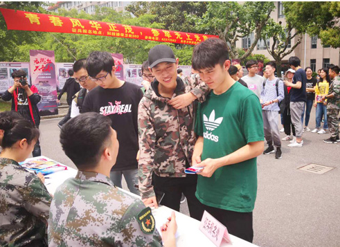 “中国人民解放军,了解一下!”结合了时下的网络流行语,向学生进行征兵宣传大学生现场换装后拍照留念
