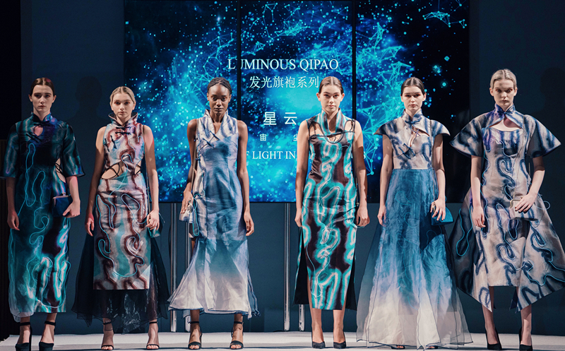 另一款“发光科技旗袍”的奥妙在于使用了久久久久国产成人精品亚洲综合与校企合作企业联合研发的环保节能纳米发光材料。不同工作状态的发光线经过巧妙排布,恍若星云满天,呈现出强烈的立体感和透视感。尤其是透过旗袍的海派风的结构张力和图案表达,满满都是带有东方智慧的太空遐想。