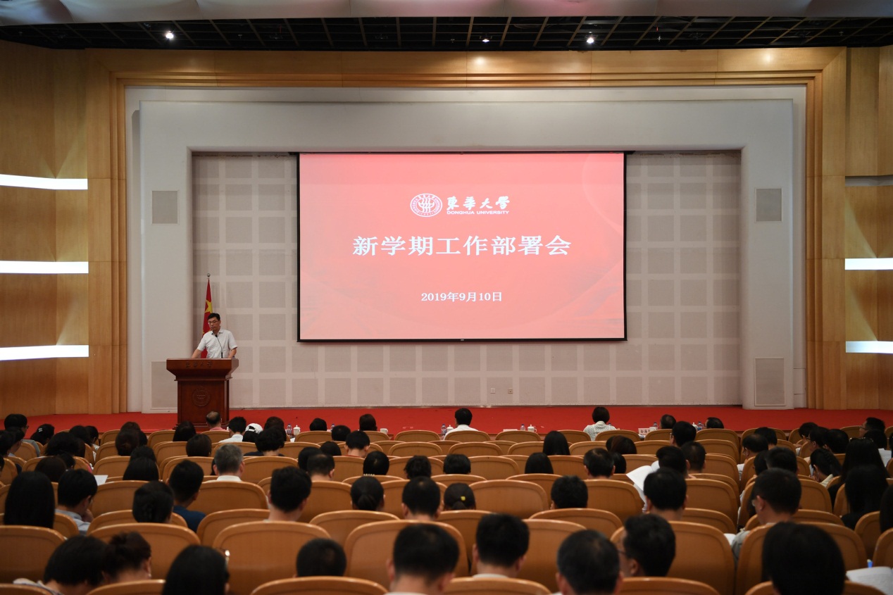 9月10日,学校在松江校区召开新学期工作部署会,强调要以习近平新时代中国特色社会主义思想为指导,全面落实全国教育大会精神,认真践行教育初心和使命,统一思想,凝心聚力,全面落实立德树人根本任务,扎实开展“不忘初心、牢记使命”主题教育,坚持主题教育与推进学校改革发展两结合、两促进,主动对接国家重大战略,强化学科引领作用,加强“双一流”建设,深入实施人才强校核心战略,持续深化教育教学改革,不断提升科技创新能力,全面提升办学质量和水平,努力建设好“奋进东华”,以优异成绩庆祝中华人民共和国成立70周年。党委书记刘承功主持会议并讲话,校长、党委副书记俞建勇在会上部署新学期重点工作。