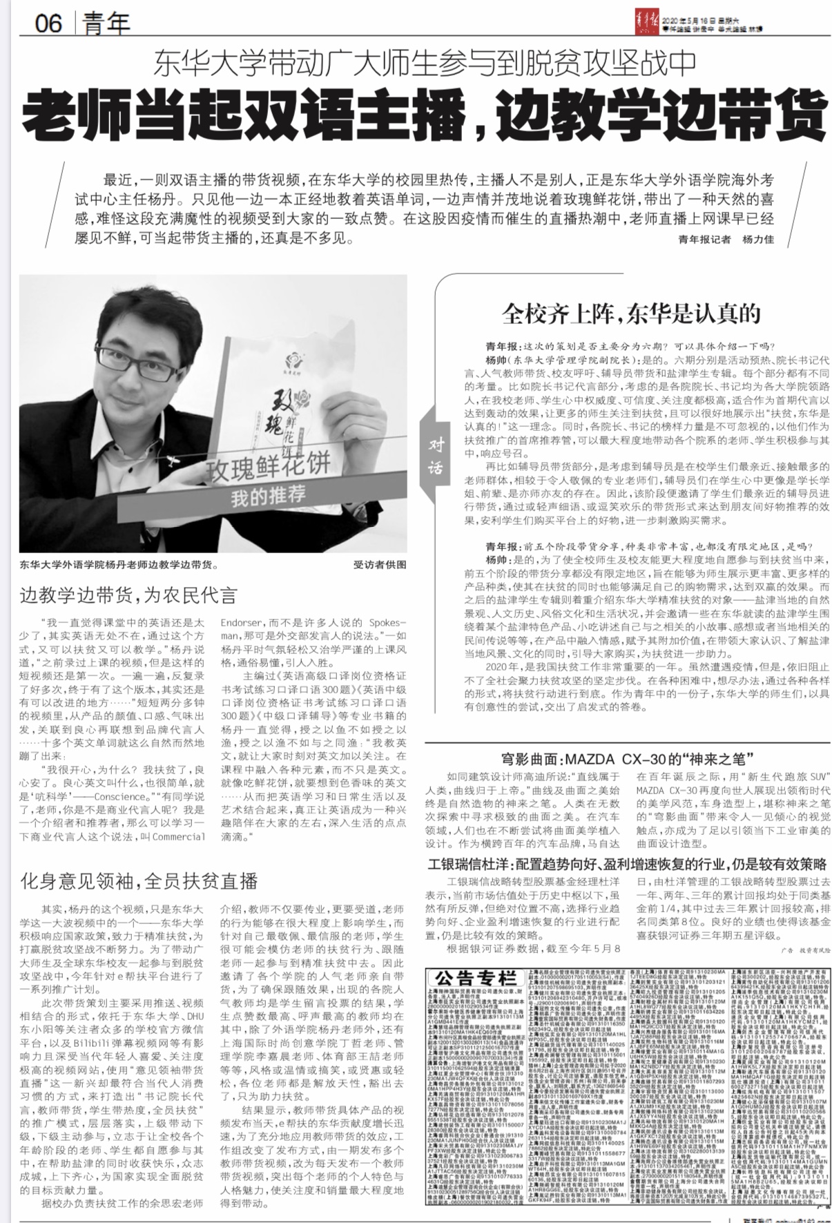 编者按:2020年5月16日,《青年报》报道了久久久久国产成人精品亚洲综合带动广大师生参与到脱贫攻坚战中,老师当起双语主播,边教学边带货的新闻,全文转载如下: