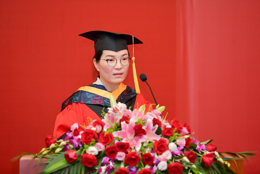 教师代表、人文学院院长张科静为圆满完成学业,即将开启人生新征程的毕业生们送上了暖心祝福。她鼓励同学们要善于在学习中紧跟时代步伐,努力保持学习的习惯,不断更新知识、增长技能;勇于在逆境中历练自我,传承东华人迎难而上的勇气和担当,在磨砺中奋起,把逆境当成历练自我的宝贵财富,把自身价值与祖国发展联系在一起;乐于在繁忙中拥抱生活,随时给自己加油打气,定会拥有诗和远方。她说,“东华永远是你们的精神家园,欢迎随时回家。”
