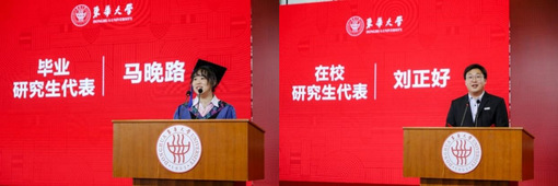 2023届研究生马晚路代表毕业生发言。她从母校赠予的三种力量出发,回顾了三年来在东华的成长与收获,表达了对母校、师长和同学在特殊时期给予的生活照顾、科研培育的感恩之情,号召毕业生们将“小我”融入“大我”,为国家发展贡献自己的一份力量!2021级硕士研究生刘正好代表在校研究生为学长学姐送上真挚祝福。祝愿即将奔赴前程的学长学姐勇毅笃行、不负青春,在砥砺奋进中绽放大写青春,让“崇德博学,砺志尚实”的校训成为永久的誓言,让东华人的身份成为再遇见时心照不宣的默契!